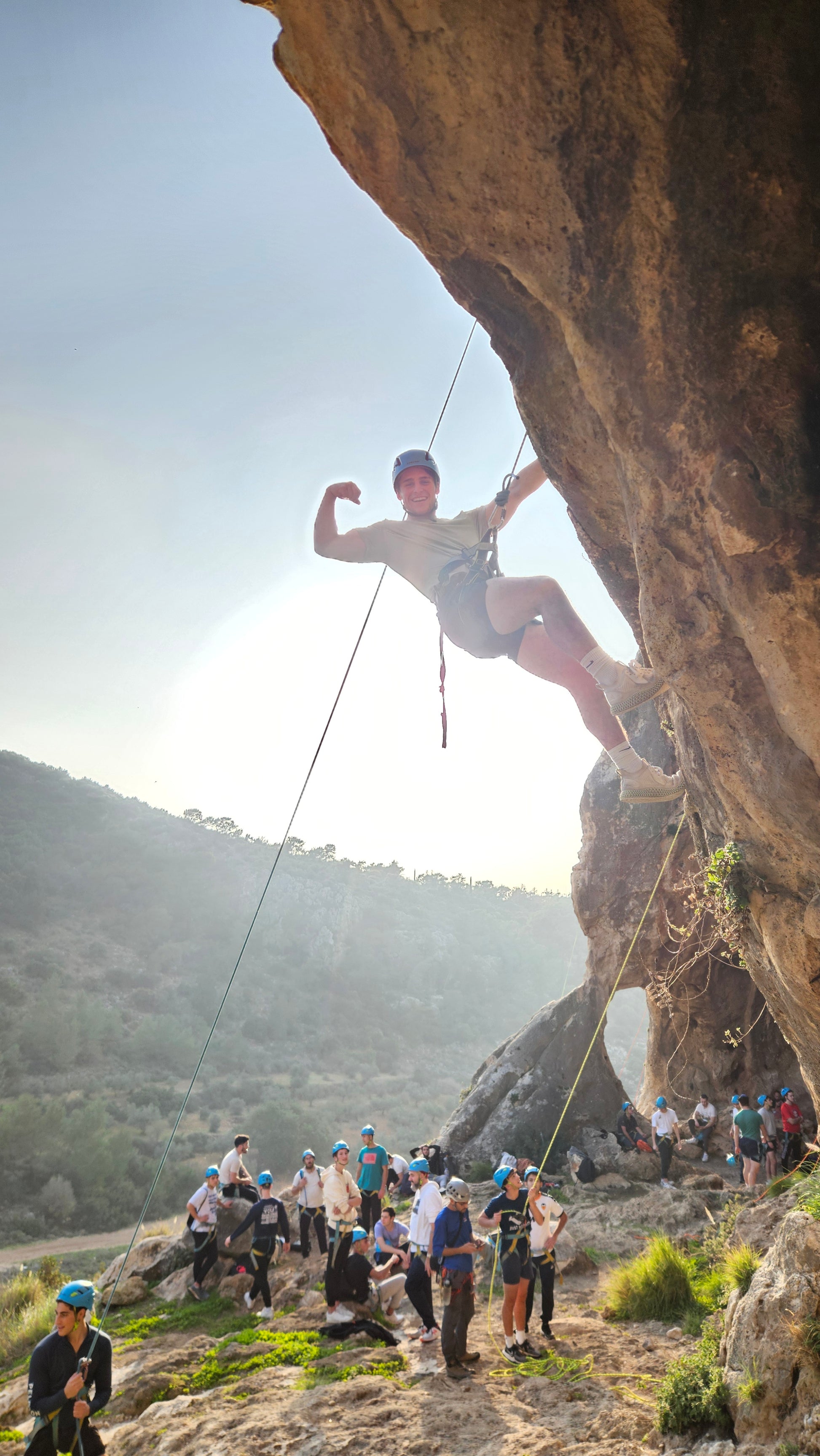 מצוק יונים קיבל את שמו ממערת יונים הנמצאת בשמורת הר גמל – מספר קילומטרים מערבית לכרמיאל – הגליל המערבי. זהו אתר מקסים המאופיין בכך שהוא קרוב מאד לכביש (הליכה של 5 דקות) אך נדיר למצוא שם אנשים אחרים אפילו בימי חג ובחופשות. הוא ידוע יותר בקרב קהיליית המטפסים בישראל כיוון שיש במצוק מס' רב של מסלולי טיפוס ברמות שונות ובגבהים של כ 10-30 מטרים.אנו ניפגש בתחנת דלק בצומת הקרובה, ויחד ניסע אל מגרש החניה הקטן בו נשאיר את הרכבים. לאחר הליכה של כ5 דקות, נוף מרהיב של הרי הגליל המערבי יפתח לפנינו ואנו נעצור כדי להתרשם מן הנוף ולקבל קצת הכוונה והסבר מן המדריך – איפה אנחנו, מה אנחנו רואים וכדומה.אנו נמצאים למעשה מעל המצוק וכדי להגיע לתחתיתו – ניעזר בחבלים ובציוד סנפלינג, נגלוש דרך אחד הפתחים אל מערה (מוארת, אין צורך בפנסים) רחבת ידיים, מוצלת וקרירה, המספקת בקיץ – הגנה מפני השמש ובחורף, הגנה מפני גשם ורוחות. ישנו מסלול רגלי קצר המחבר בין תחתית המצוק לנקודה הגבוהה שלו, כך שכל מי שמעוניין לגלוש פעם נוספת (מומלץ) – יוכל לעשות זאת בקלות ובליווי המדריך.לאחר שסיימנו עם הסנפלינג – גלישת המצוקים, נמשיך אל הפעילות הבאה – טיפוס צוקים!כאמור, זהו גן עדן עבור מטפסים חובבים ומקצועיים, סביר להניח שתפגשו בזוג מטפסים או יותר בביקורכם במצוק יונים. תוכלו להתנסות בטיפוס מספר מסלולים, תקבלו הדרכה, עצות וטיפים מן המדריך שלכם ומובטח לכם שאת הדרך חזרה אל נקודת ההתחלה ואל החנייה, תעשו בשארית כוחכם…:)מצוק יונים הינו אתר נהדר ומתאים למתחילים ולמנוסים כאחד, כל הפעילויות אינן חובה והן אינן תלויות אחת בשנייה. כך שניתן לדלג על הסנפלינג ולעבור לטיפוס או להיפך. הטבע, השקט, היופי הפראי של שמורת הר גמל והפעילויות המאתגרות שלנו – מבטיחות לכם יום קסום שלא יישכח במהיר